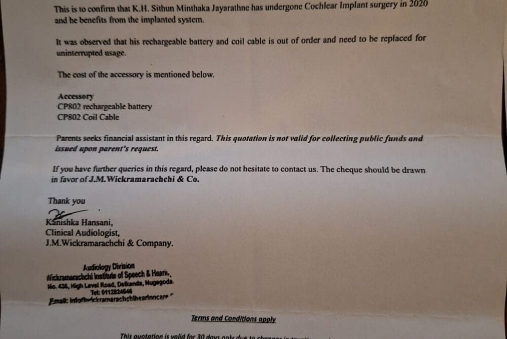 Assistance for Shihab Aaqil Ahamed, a student at University of Moratuwa to by a hearing aid