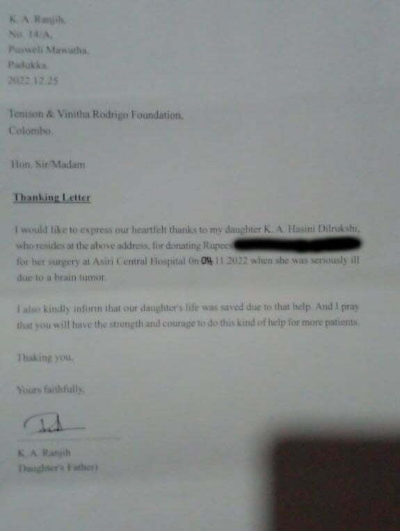 A 20 year old only child whose parents are government servants was assisted with surgery. She has sat for the GCE A/L examination in (Bio Science) 2021 was awaiting to begin a bright future.