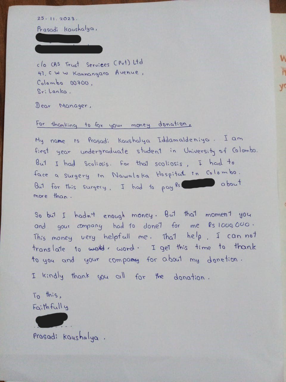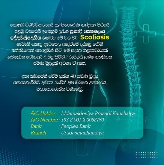 Prasadi Iddamaldeniya, a first-year undergraduate student was suffering from Severe Spinal Deformity-Scoliosis. The corrective surgery for severe spinal deformity was performed under the supervision of Dr. Vasantha Perera at Nawaloka Hospitals PLC and the trust contributed towards expenses for treatment.