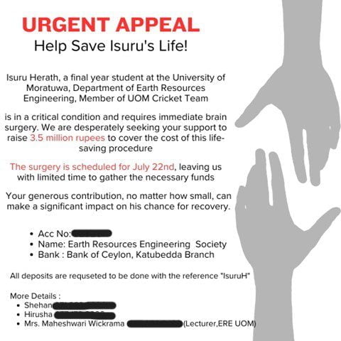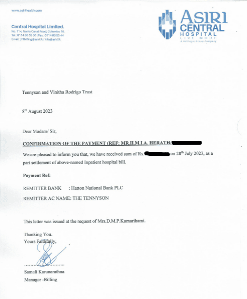 H M I A Herath was a final-year engineering student at a reputed university. He was in a critical condition and required immediate brain surgery. The trust contributed towards expenses for his treatment.