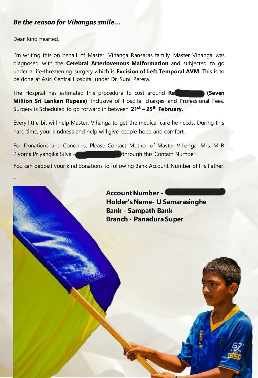 Vihanga Ransara, a grade 11 student from Panadura, was diagnosed with “Cerebral Arteriovenous Malformation” and was subjected to go under a life-threatening left temporal AVM surgery. The trust contributed towards the expenses for treatment.